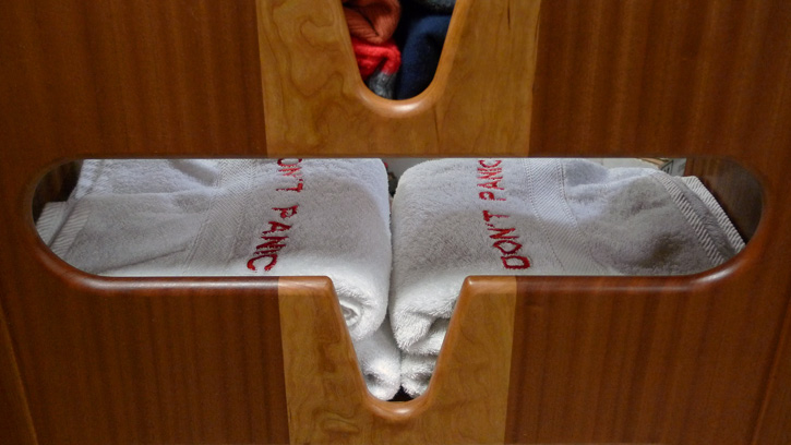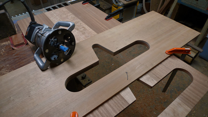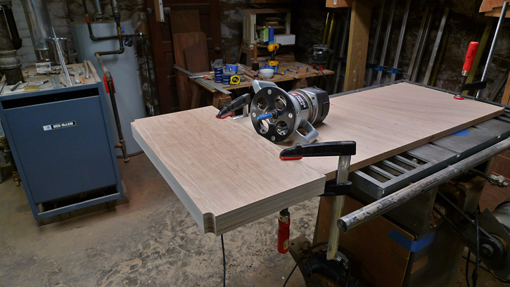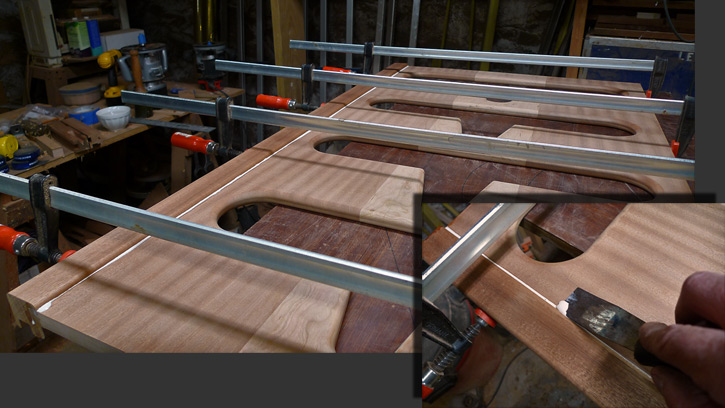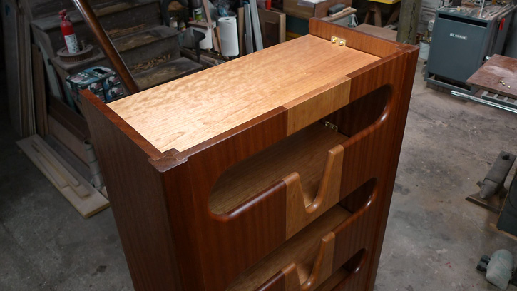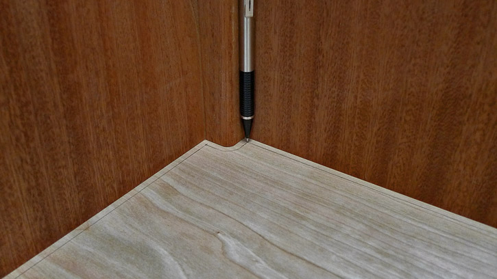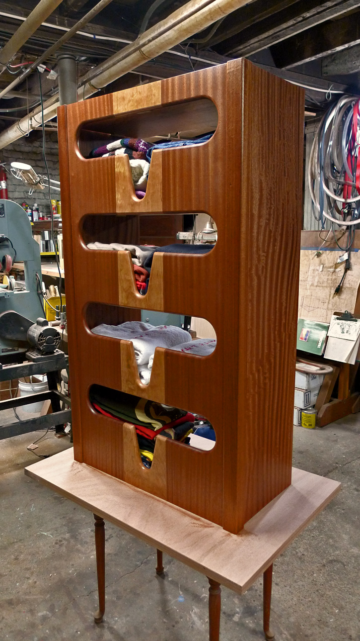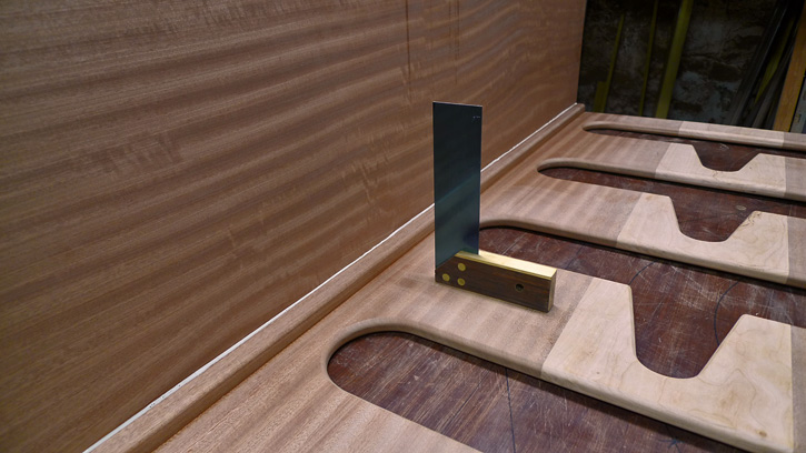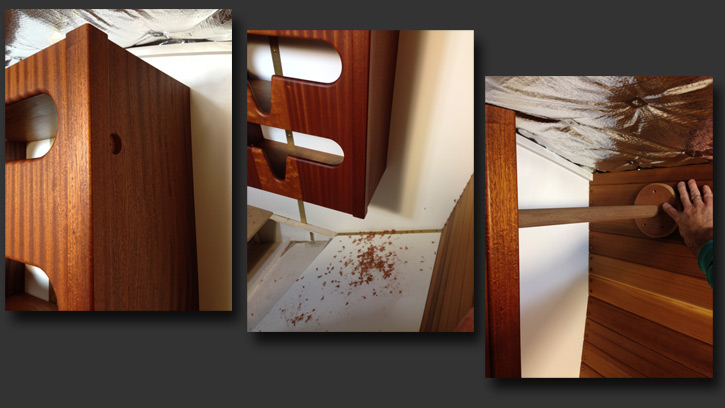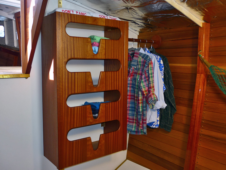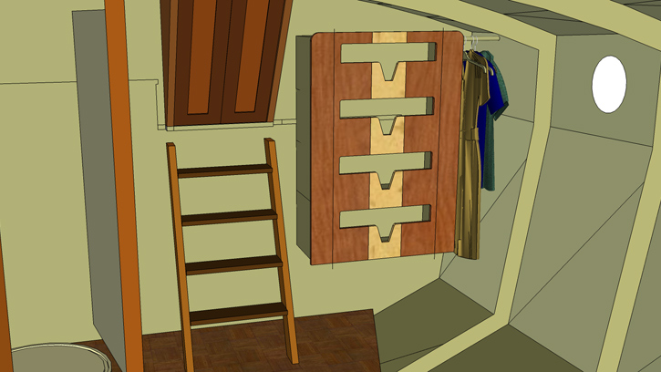 I continued with the cherry-stripe theme for Helge's clothes closet and added hanging space to the starboard side. The cherry plywood shelves are secured with three brackets each.
